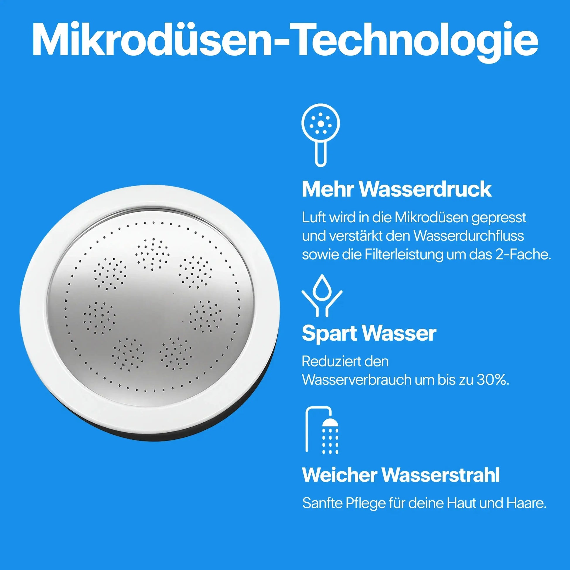 Der Duschkopf mit Filter ist die perfekte Lösung für alle, die ihre Haut und Haare vor Kalk, Chlor und anderen Schadstoffen im Wasser schützen möchten. Die integrierte Filtertechnologie reinigt das Wasser direkt beim Duschen für ein spürbar angenehmeres, sanfteres Duschgefühl. Schon nach wenigen Anwendungen fühlt sich deine Haut weicher an, trocknet weniger aus und zeigt weniger Reizungen. Gefiltertes Wasser hilft, Hauttrockenheit zu reduzieren, Irritationen vorzubeugen und die natürliche Schutzbarriere deiner Haut zu stärken, ganz ohne zusätzliche Pflegeprodukte.