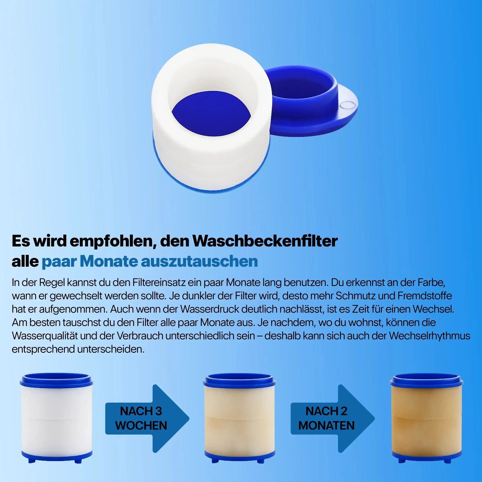 Je nach Wasserqualität solltest du den Filter alle paar Monate austauschen. Wenn das Wasser langsamer fließt oder der Filter dunkler wird, ist es Zeit für einen Wechsel.